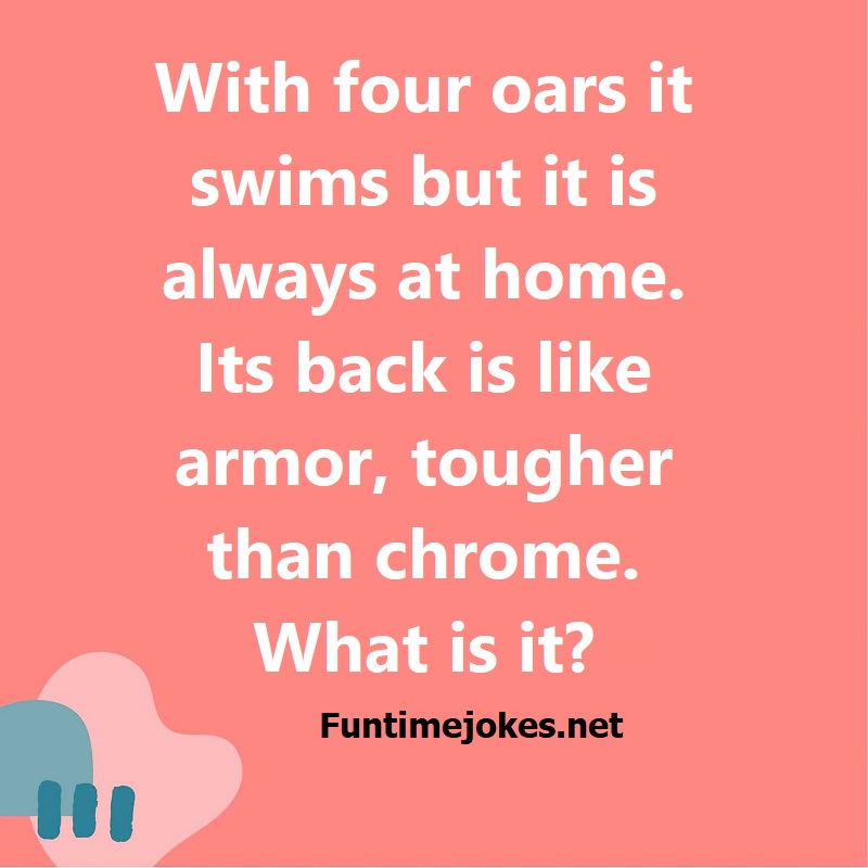 π Take the 15-Riddle Challenge (Win at 80%+)With four oars it swims but it is always at home. Its back is like armor, tougher than chrome. What is it?