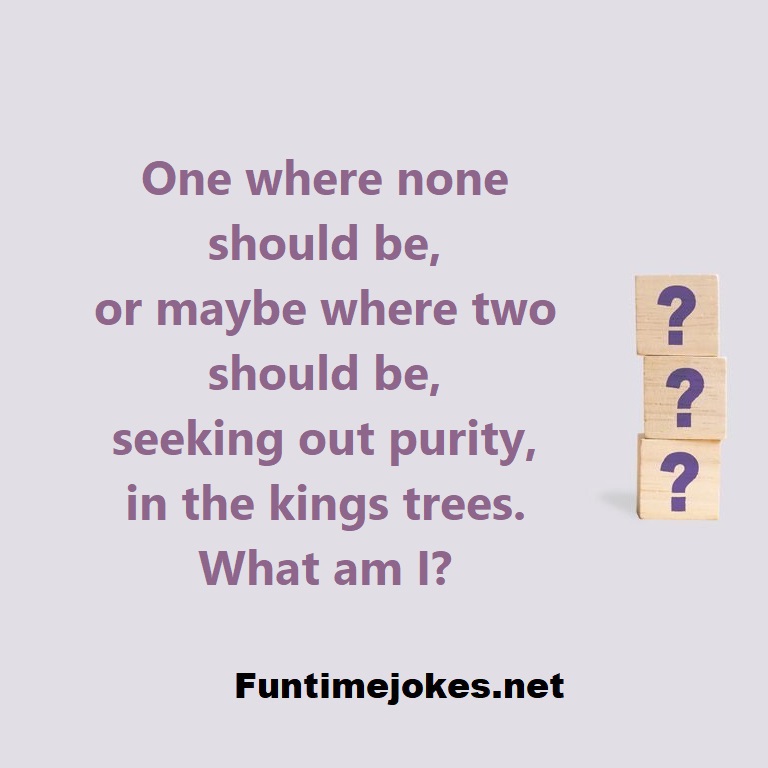 π Take the 15-Riddle Challenge (Win at 80%+)One where none should be, or maybe where two should be, seeking out purity, in the kings trees. What am I?