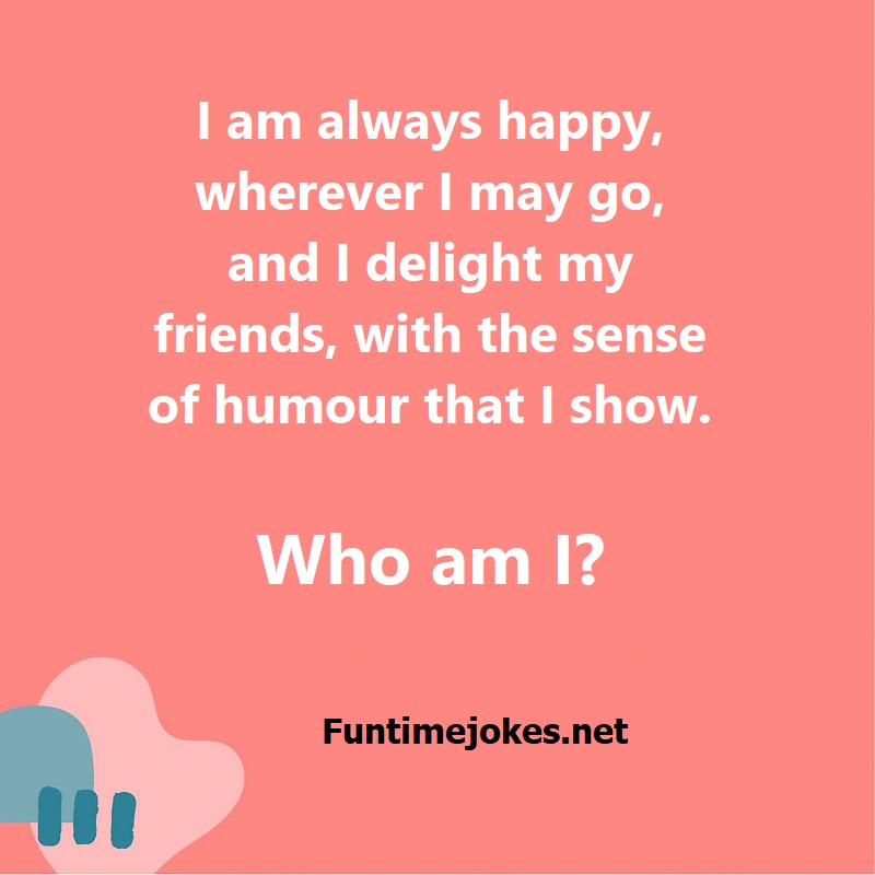 π Take the 15-Riddle Challenge (Win at 80%+)I am always happy, wherever I may go, and I delight my friends, with the sense of humour that I show. Who am I?
