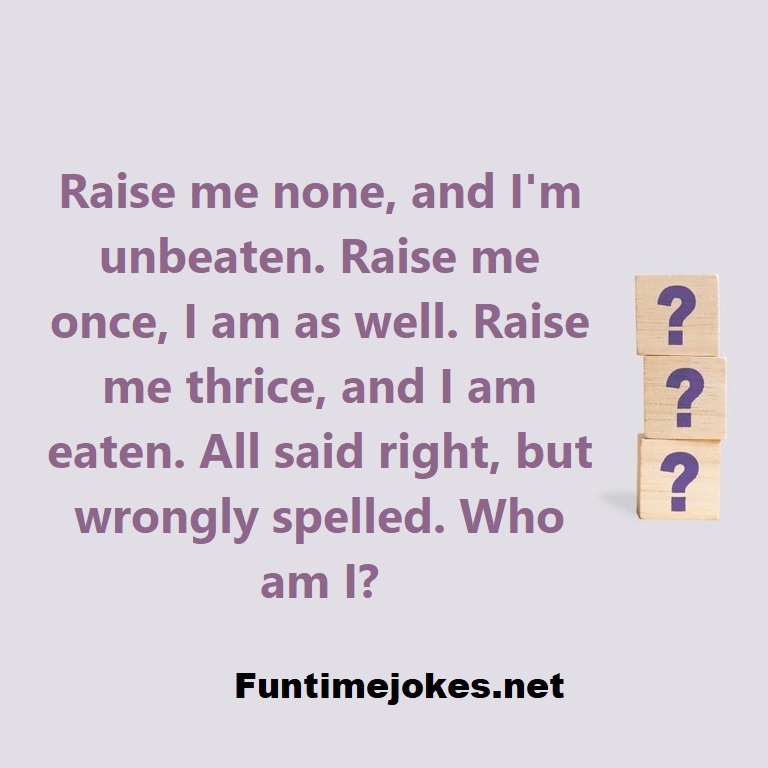 π Take the 15-Riddle Challenge (Win at 80%+)Raise me none, and I am unbeaten. Raise me once, I am as well. Raise me thrice, and I am eaten. All said right, but wrongly spelled. Who am I?