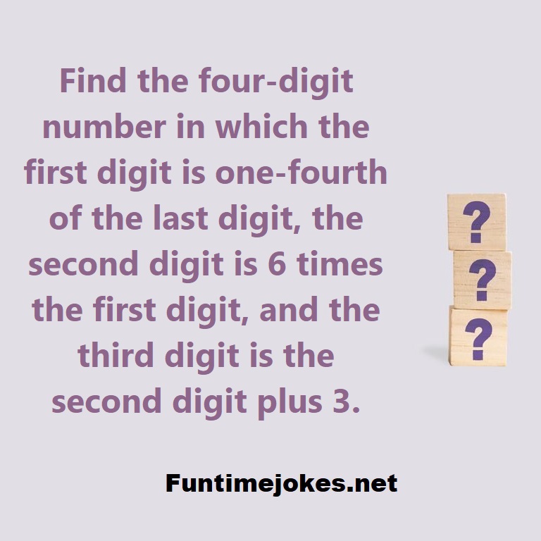 π Take the 15-Riddle Challenge (Win at 80%+)Find the four-digit number in which the first digit is one-fourth of the last digit, the second digit is 6 times the first digit, and the third digit is the second digit plus 3.