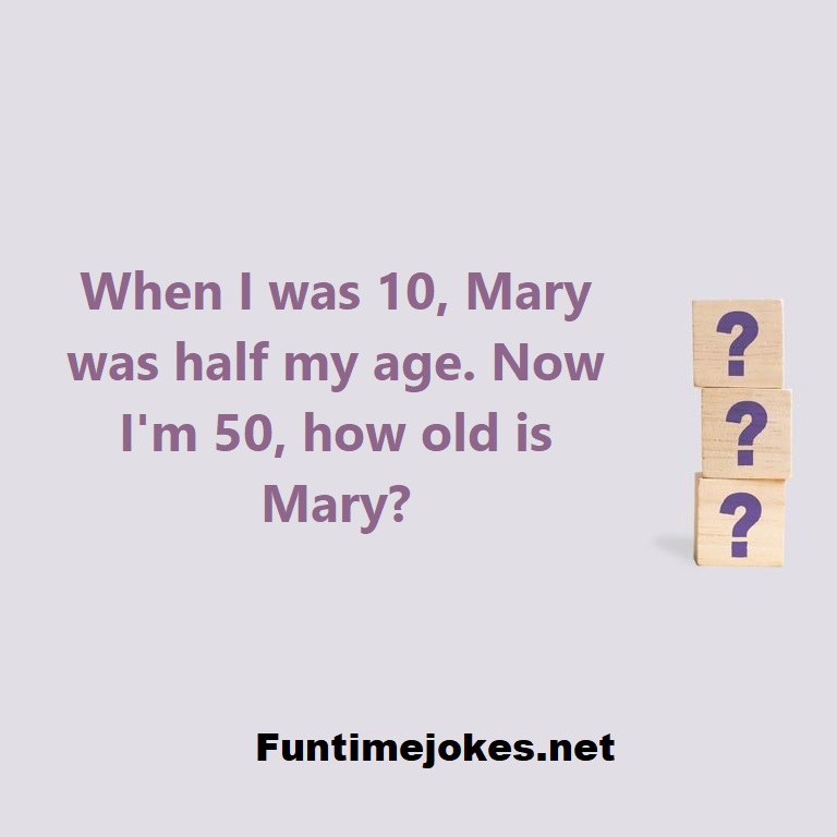 π Take the 15-Riddle Challenge (Win at 80%+)When I was 10, Mary was half my age. Now I am 50, how old is Mary?