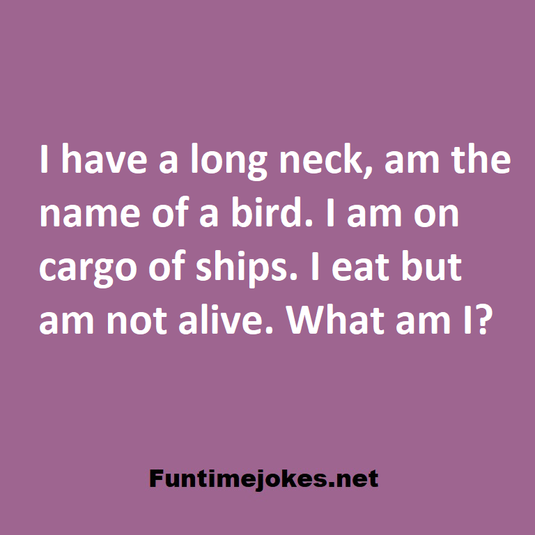 π Take the 15-Riddle Challenge (Win at 80%+)I have a long neck, am the name of a bird. I am on cargo of ships. I eat but am not alive. What am I?