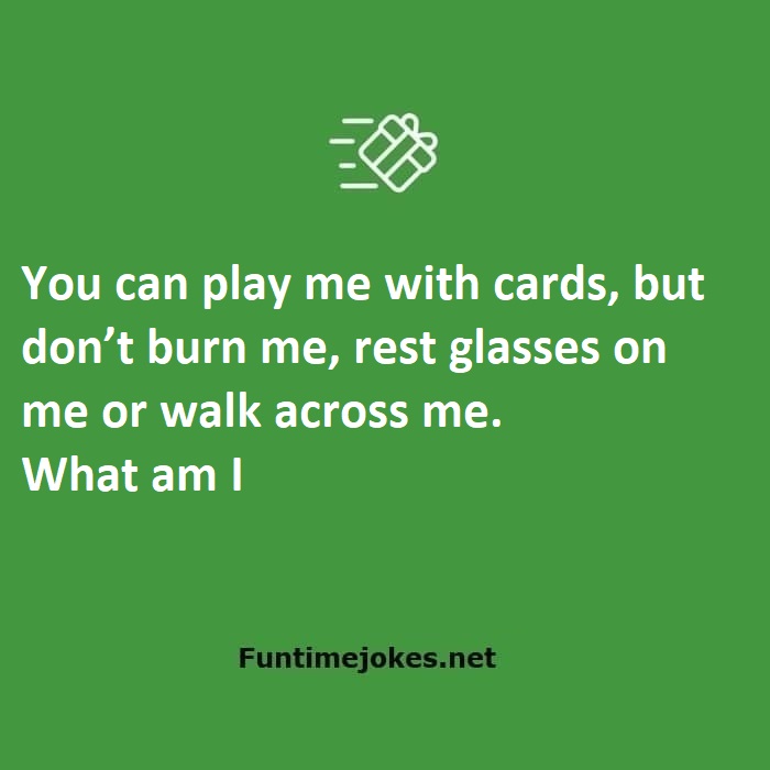 🎈 Pop Balloon Riddles (Tap to reveal answers)You can play me with cards, but don’t burn me, rest glasses on me or walk across me. What am I is one of the best riddle of the day.We have best collections of riddles, You can see our best collection of Tricky Riddles with Answer