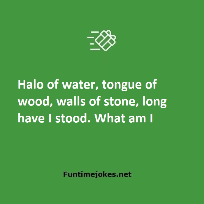 Halo of water, tongue of wood, walls of stone, long have I stood. What am I is one of the best riddle of the day.We have best collections of riddles, You can see our best collection of Tricky Riddles with Answer Funtimejokes be the be the world's most knowledge able riddle website on the internet for riddles, puzzles, rebus caps and quizzes. Our riddle library has interesting riddles and answers to riddles for adults and evoke deep thought and community discussion. Riddlers will benefit from the creativity of our members who participate in growth of our online riddles and puzzles resource. We encourage you to become a member of Riddles and receive daily/weekly free riddles email.