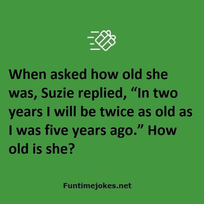 🏆 Take the 15-Riddle Challenge (Win at 80%+)When asked how old she was, Suzie replied, “In two years I will be twice as old as I was five years ago.” How old is she