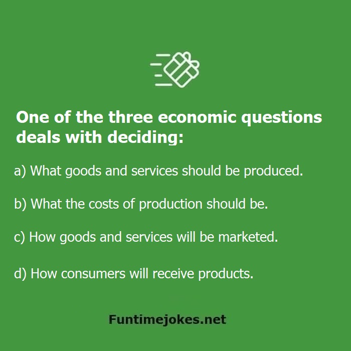 π Pop Balloon Riddles (Tap to reveal answers)One of the three economic questions deals with deciding: a) What goods and services should be produced. b) What the costs of production should be. c) How goods and services will be marketed. d) How consumers will receive products. is one of the best riddle of the day.We have best collections of riddles, You can see our best collection of Tricky Riddles with Answer