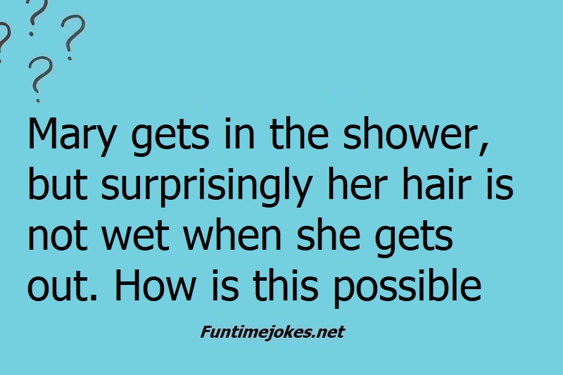 π Take the 15-Riddle Challenge (Win at 80%+)Mary gets in the shower, but surprisingly her hair is not wet when she gets out. How is this possible