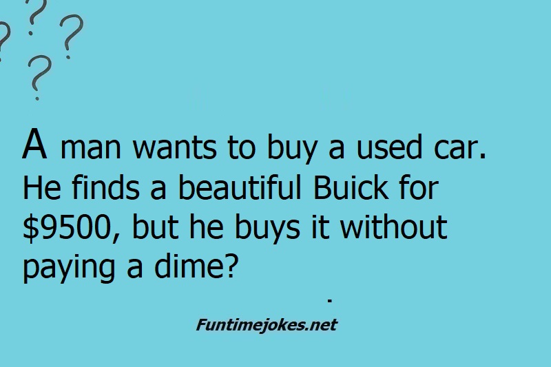 π Take the 15-Riddle Challenge (Win at 80%+)A man wants to buy a used car. He finds a beautiful Buick for $9500, but he buys it without paying a dime. How did he manage this?