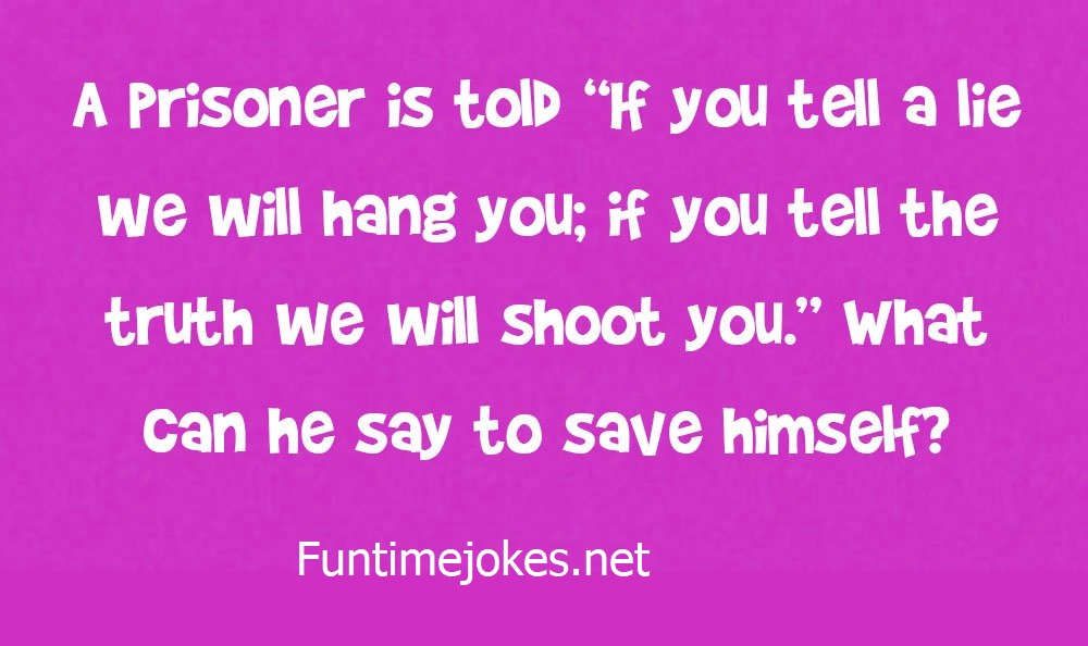 A Prisoner Is Told If You Tell A Lie We Will Hang You, If You Tell Truth We Will Shoot You is one of the best riddle of the day.We have best collections of riddles, You can see our best collection of Tricky Riddles with Answer Funtimejokes be the be the world's most knowledge able riddle website on the internet for riddles, puzzles, rebus caps and quizzes. Our riddle library has interesting riddles and answers to riddles for adults and evoke deep thought and community discussion. Riddlers will benefit from the creativity of our members who participate in growth of our online riddles and puzzles resource. We encourage you to become a member of Riddles and receive daily/weekly free riddles email.