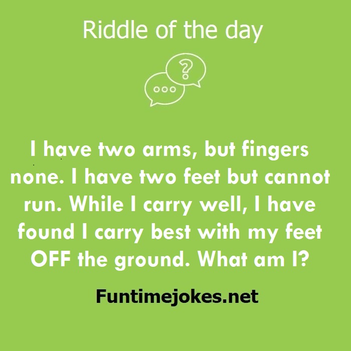 π Pop Balloon Riddles (Tap to reveal answers)I have two arms, but fingers none. I have two feet but cannot run. While I carry well, I have found I carry best with my feet OFF the ground. What am I? is one of the best riddle of the day.We have best collections of riddles, You can see our best collection of Tricky Riddles with Answer