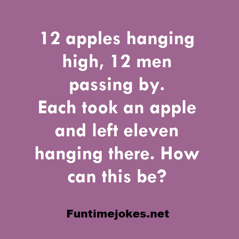 π Take the 15-Riddle Challenge (Win at 80%+)12 apples hanging high, 12 men passing by. Each took an apple and left eleven hanging there. How can this be?