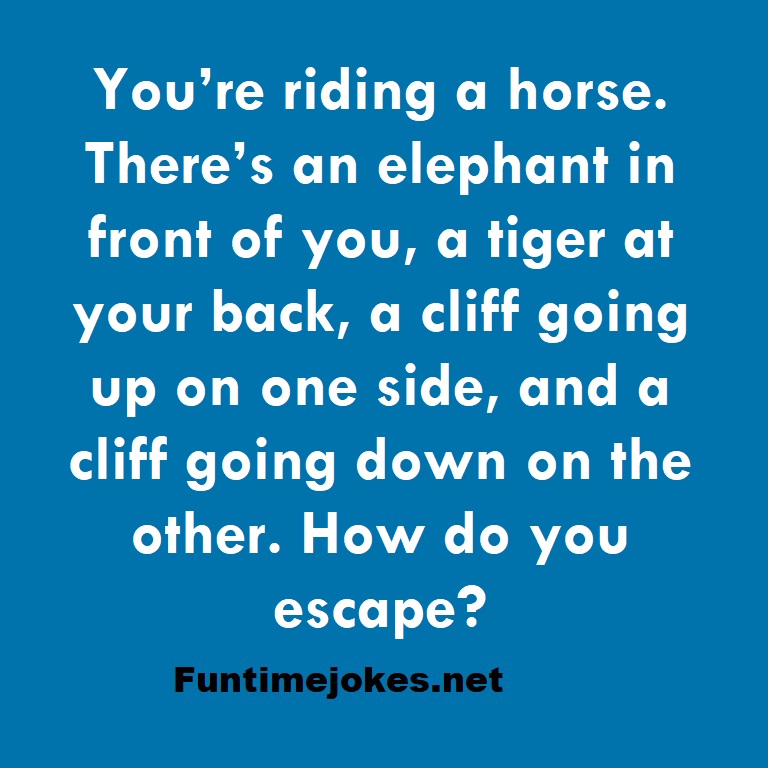 🏆 Take the 15-Riddle Challenge (Win at 80%+)You’re riding a horse. There’s an elephant in front of you, a tiger at your back, a cliff going up on one side, and a cliff going down on the other. How do you escape?