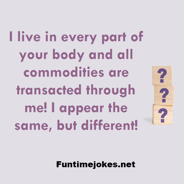 π Take the 15-Riddle Challenge (Win at 80%+)I live in every part of your body and all commodities are transacted through me! I appear the same, but different!