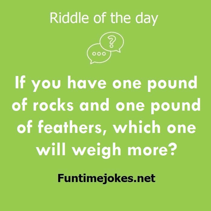 π Pop Balloon Riddles (Tap to reveal answers)If you have one pound of rocks and one pound of feathers, which one will weigh more? is one of the best riddle of the day.We have best collections of riddles, You can see our best collection of Tricky Riddles with Answer