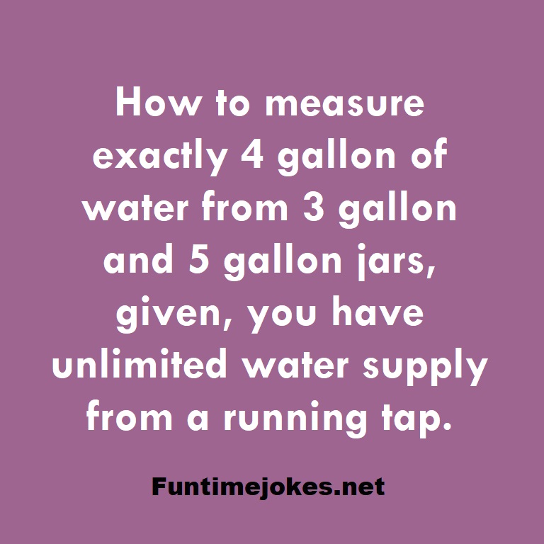We encourage you to subscribe us to receive our Daily/Weekly riddles newsletter. How to measure exactly 4 gallon of water from 3 gallon and 5 gallon jars, given, you have unlimited water supply from a running tap. is one of the best riddle of the day.We have best collections of riddles, You can see our best collection of Tricky Riddles with Answer