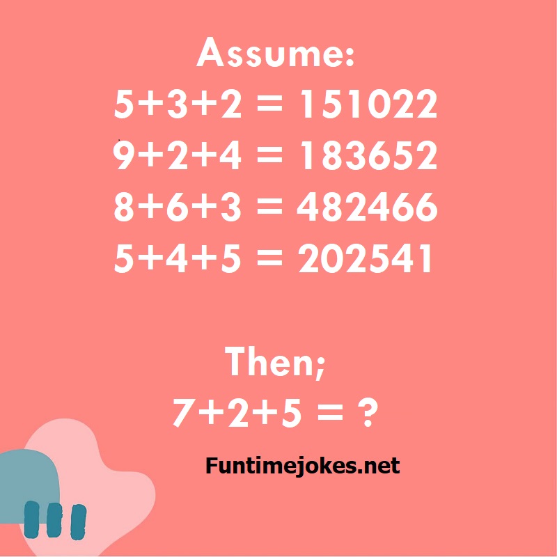 We encourage you to subscribe us to receive our Daily/Weekly riddles newsletter. Assume: 5+3+2 = 151022 9+2+4 = 183652 8+6+3 = 482466 5+4+5 = 202541 Then; 7+2+5 = ? is one of the best riddle of the day.We have best collections of riddles, You can see our best collection of Tricky Riddles with Answer