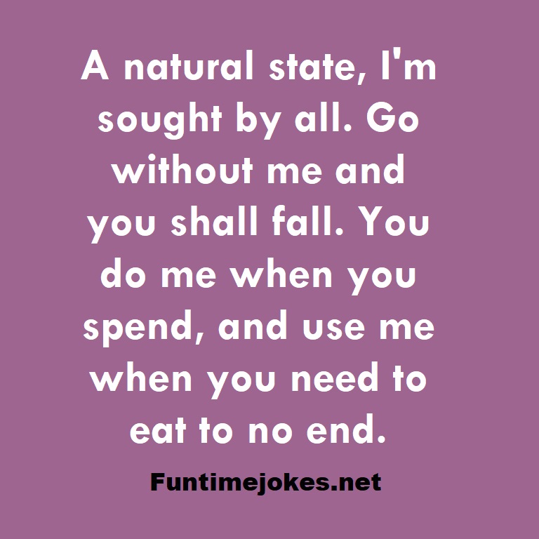 π Take the 15-Riddle Challenge (Win at 80%+)A natural state, I'm sought by all. Go without me and you shall fall. You do me when you spend, and use me when you need to eat to no end.