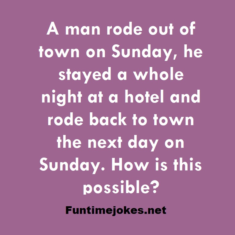 π Pop Balloon Riddles (Tap to reveal answers)A man rode out of town on Sunday, he stayed a whole night at a hotel and rode back to town the next day on Sunday. How is this possible? is one of the best riddle of the day.We have best collections of riddles, You can see our best collection of Tricky Riddles with Answer