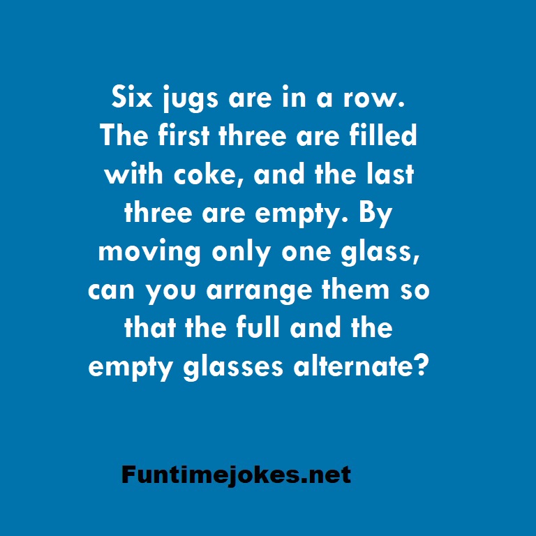 π Pop Balloon Riddles (Tap to reveal answers)Six jugs are in a row. The first three are filled with coke, and the last three are empty. By moving only one glass, can you arrange them so that the full and the empty glasses alternate? is one of the best riddle of the day.We have best collections of riddles, You can see our best collection of Tricky Riddles with Answer