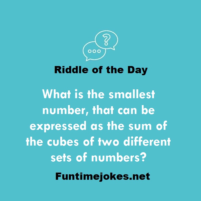 π Pop Balloon Riddles (Tap to reveal answers)What is the smallest number, that can be expressed as the sum of the cubes of two different sets of numbers? is one of the best riddle of the day.We have best collections of riddles, You can see our best collection of Tricky Riddles with Answer
