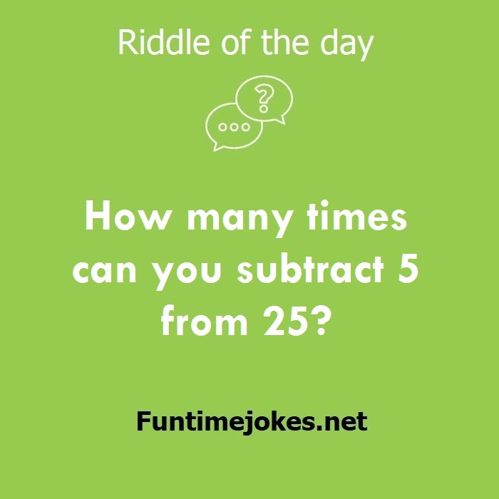 We encourage you to subscribe us to receive our Daily/Weekly riddles newsletter. How many times can you subtract 5 from 25? is one of the best riddle of the day.We have best collections of riddles, You can see our best collection of Tricky Riddles with Answer