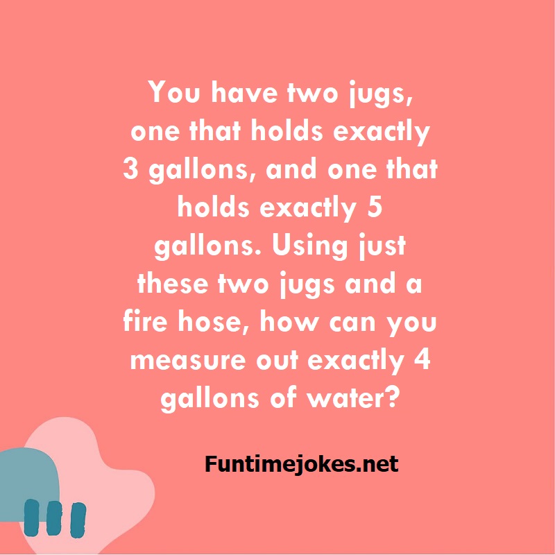 We encourage you to subscribe us to receive our Daily/Weekly riddles newsletter. You have two jugs, one that holds exactly 3 gallons, and one that holds exactly 5 gallons. Using just these two jugs and a fire hose, how can you measure out exactly 4 gallons of water? is one of the best riddle of the day.We have best collections of riddles, You can see our best collection of Tricky Riddles with Answer