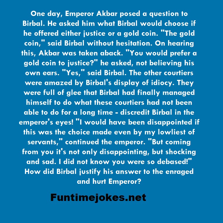 🏆 Take the 15-Riddle Challenge (Win at 80%+)One day, Emperor Akbar posed a question to Birbal. He asked him what Birbal would choose if he offered either justice or a gold coin. "The gold coin," said Birbal without hesitation. On hearing this, Akbar was taken aback. "You would prefer a gold coin to justice?" he asked, not believing his own ears. "Yes," said Birbal. The other courtiers were amazed by Birbal's display of idiocy. They were full of glee that Birbal had finally managed himself to do what these courtiers had not been able to do for a long time - discredit Birbal in the emperor's eyes! "I would have been disappointed if this was the choice made even by my lowliest of servants," continued the emperor. "But coming from you it's not only disappointing, but shocking and sad. I did not know you were so debased!" How did Birbal justify his answer to the enraged and hurt Emperor?