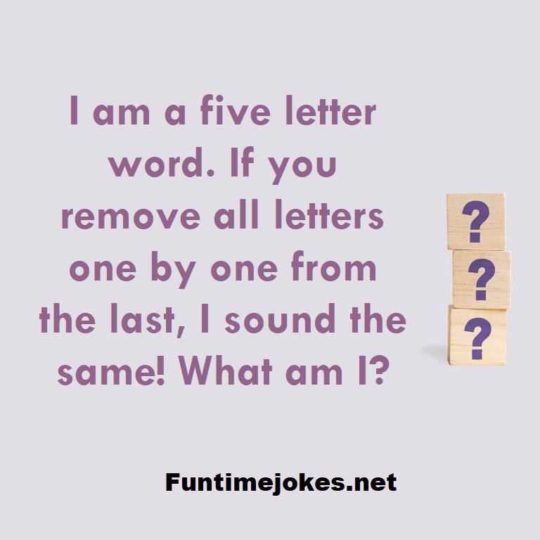 π Take the 15-Riddle Challenge (Win at 80%+)I am a five letter word. If you remove all letters one by one from the last, I sound the same! What am I?