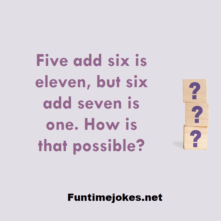 π Take the 15-Riddle Challenge (Win at 80%+)Five add six is eleven, but six add seven is one. How is that possible?