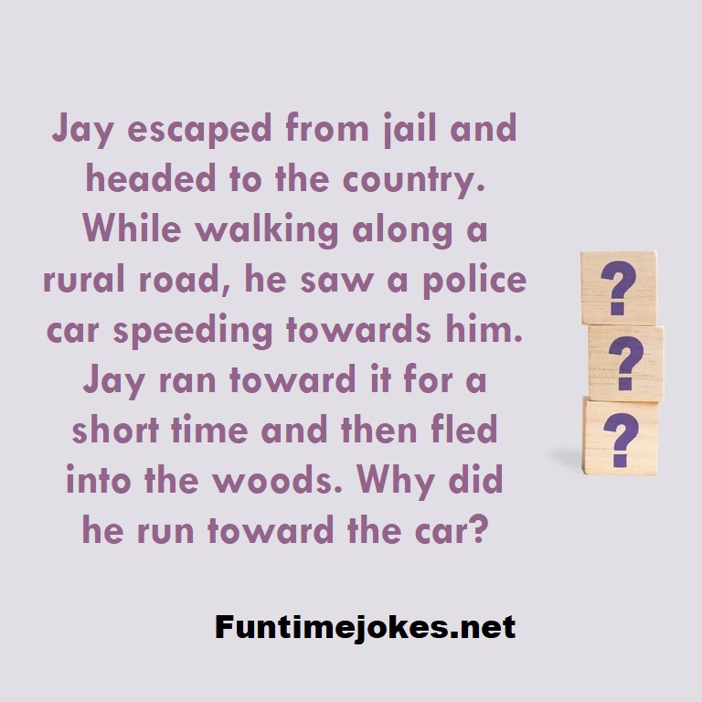 π Take the 15-Riddle Challenge (Win at 80%+)Jay escaped from jail and headed to the country. While walking along a rural road, he saw a police car speeding towards him. Jay ran toward it for a short time and then fled into the woods. Why did he run toward the car?