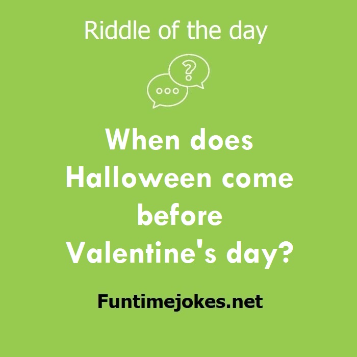 π Pop Balloon Riddles (Tap to reveal answers)When does Halloween come before Valentine's day? is one of the best riddle of the day.We have best collections of riddles, You can see our best collection of Tricky Riddles with Answer