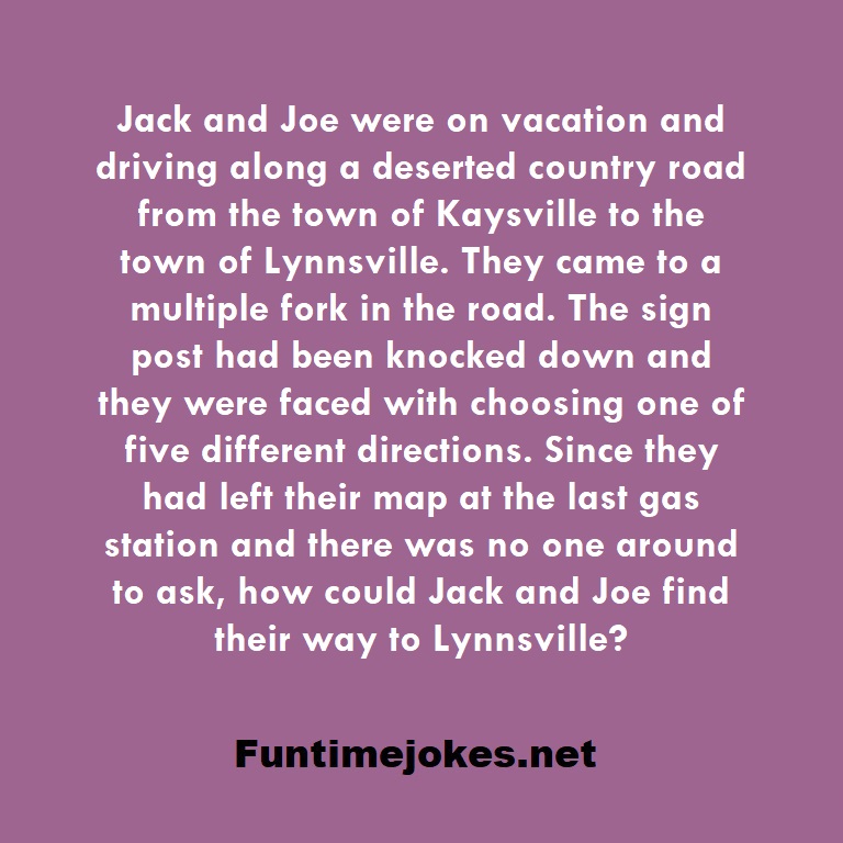 π Take the 15-Riddle Challenge (Win at 80%+)Jack and Joe were on vacation and driving along a deserted country road from the town of Kaysville to the town of Lynnsville. They came to a multiple fork in the road. The sign post had been knocked down and they were faced with choosing one of five different directions. Since they had left their map at the last gas station and there was no one around to ask, how could Jack and Joe find their way to Lynnsville?