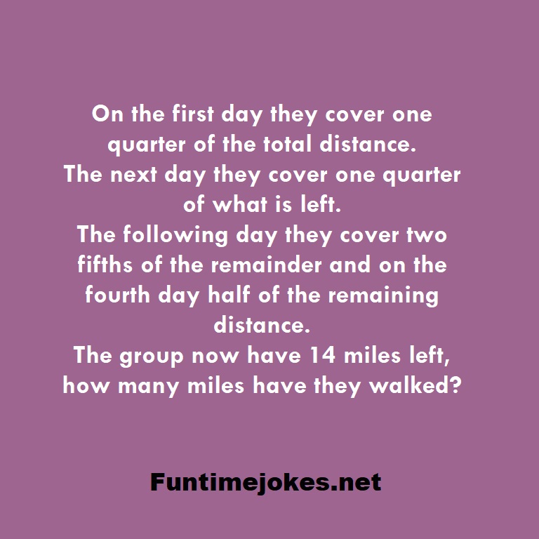 π Take the 15-Riddle Challenge (Win at 80%+)On the first day they cover one quarter of the total distance. The next day they cover one quarter of what is left. The following day they cover two fifths of the remainder and on the fourth day half of the remaining distance. The group now have 14 miles left, how many miles have they walked?
