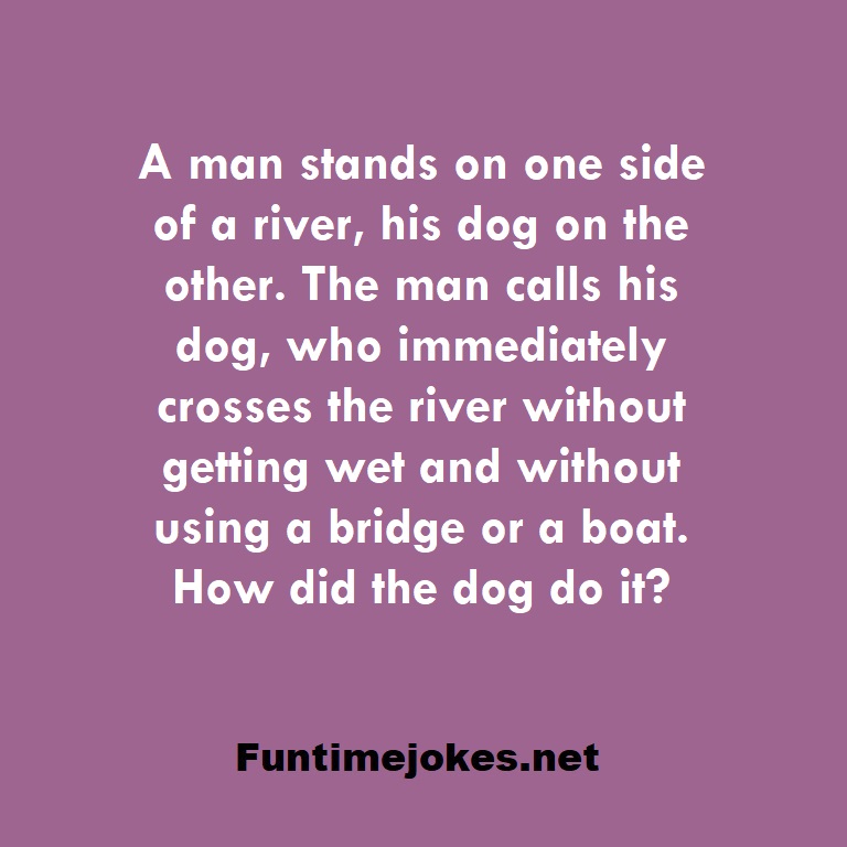 π Pop Balloon Riddles (Tap to reveal answers)A man stands on one side of a river, his dog on the other. The man calls his dog, who immediately crosses the river without getting wet and without using a bridge or a boat. How did the dog do it? is one of the best riddle of the day.We have best collections of riddles, You can see our best collection of Tricky Riddles with Answer