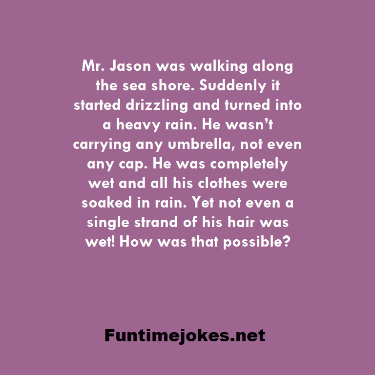 🏆 Take the 15-Riddle Challenge (Win at 80%+)Mr. Jason was walking along the sea shore. Suddenly it started drizzling and turned into a heavy rain. He wasn’t carrying any umbrella, not even any cap. He was completely wet and all his clothes were soaked in rain. Yet not even a single strand of his hair was wet! How was that possible?