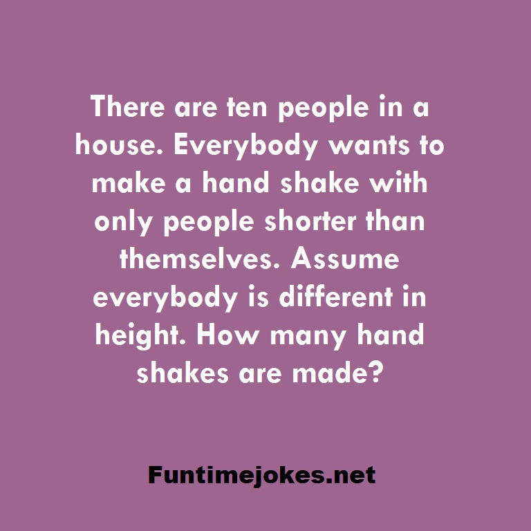 π Take the 15-Riddle Challenge (Win at 80%+)There are ten people in a house. Everybody wants to make a hand shake with only people shorter than themselves. Assume everybody is different in height. How many hand shakes are made?