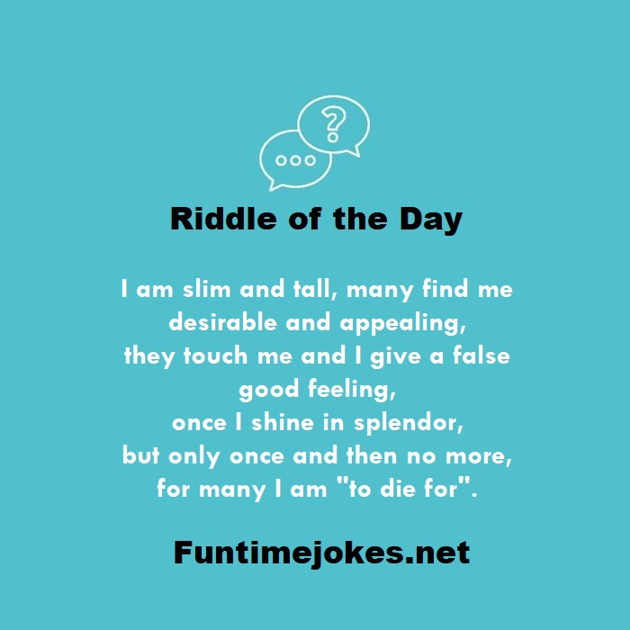 π Pop Balloon Riddles (Tap to reveal answers)I am slim and tall, many find me desirable and appealing, they touch me and I give a false good feeling, once I shine in splendor, but only once and then no more, for many I am "to die for". is one of the best riddle of the day.We have best collections of riddles, You can see our best collection of Tricky Riddles with Answer