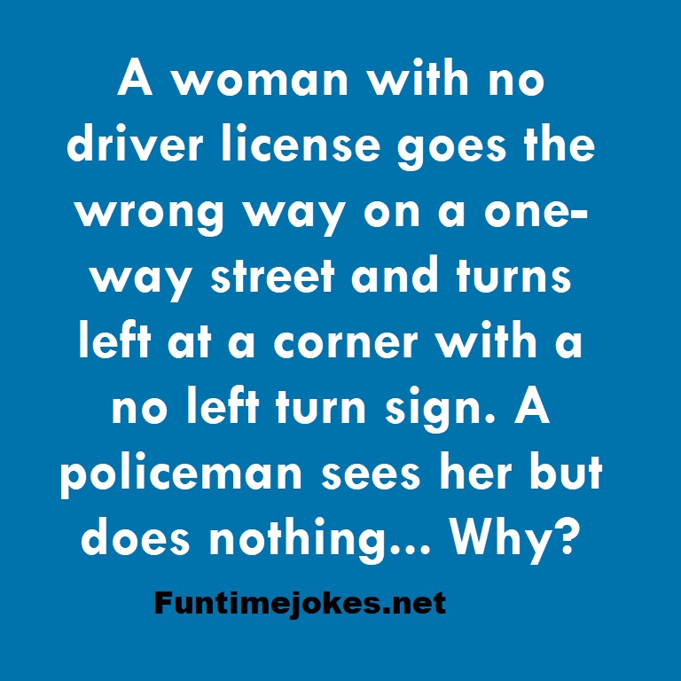 π Take the 15-Riddle Challenge (Win at 80%+)A woman with no driver license goes the wrong way on a one-way street and turns left at a corner with a no left turn sign. A policeman sees her but does nothing... Why?