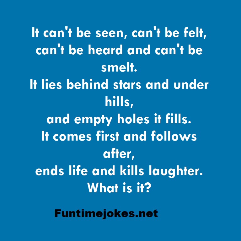 π Take the 15-Riddle Challenge (Win at 80%+)It can't be seen, can't be felt, can't be heard and can't be smelt. It lies behind stars and under hills, and empty holes it fills. It comes first and follows after, ends life and kills laughter. What is it?