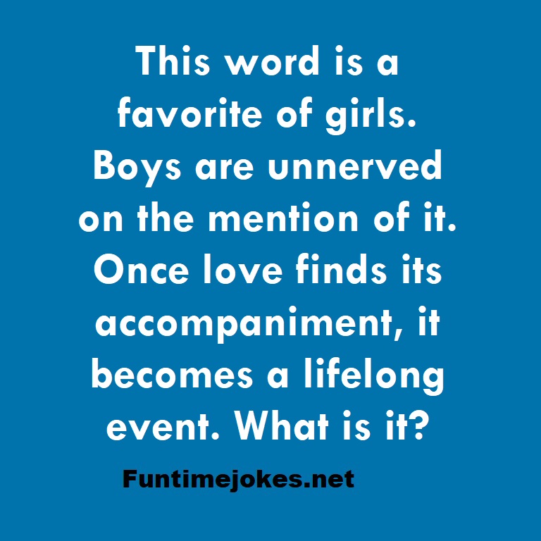 π Take the 15-Riddle Challenge (Win at 80%+)This word is a favorite of girls. Boys are unnerved on the mention of it. Once love finds its accompaniment, it becomes a lifelong event. What is it?