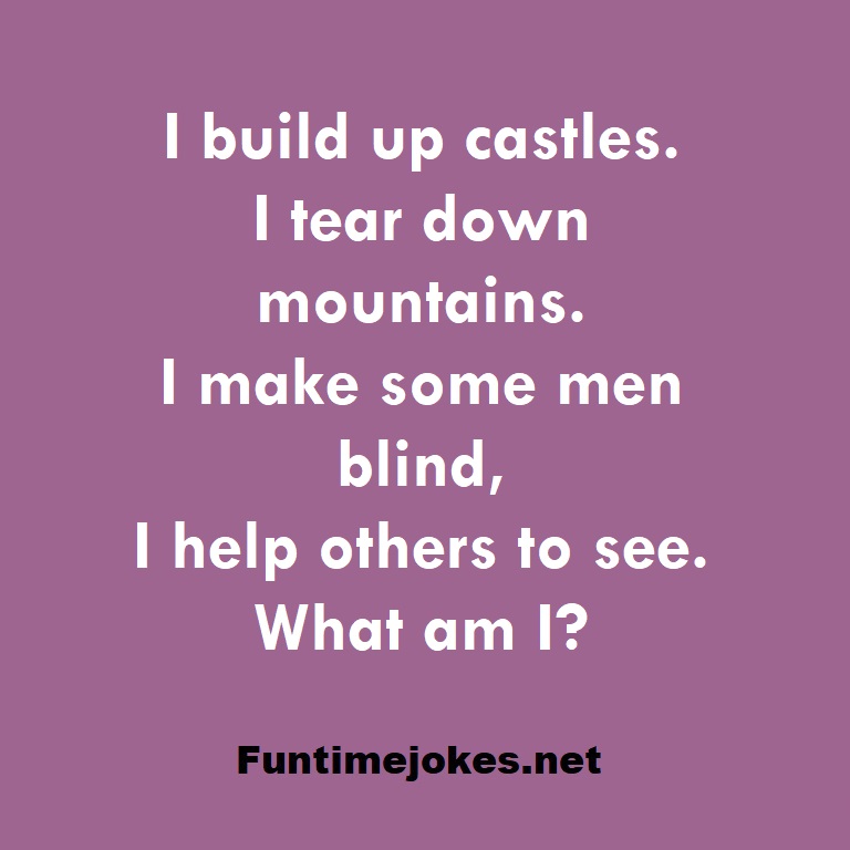 π Pop Balloon Riddles (Tap to reveal answers)I build up castles. I tear down mountains. I make some men blind, I help others to see. What am I? is one of the best riddle of the day.We have best collections of riddles, You can see our best collection of Tricky Riddles with Answer