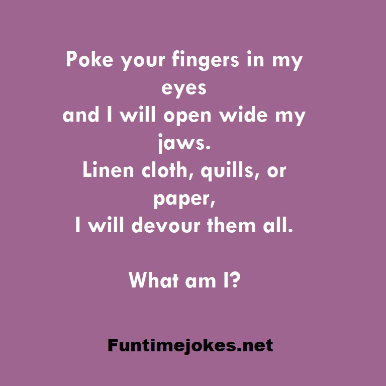 π Take the 15-Riddle Challenge (Win at 80%+)Poke your fingers in my eyes and I will open wide my jaws. Linen cloth, quills, or paper, I will devour them all. What am I?