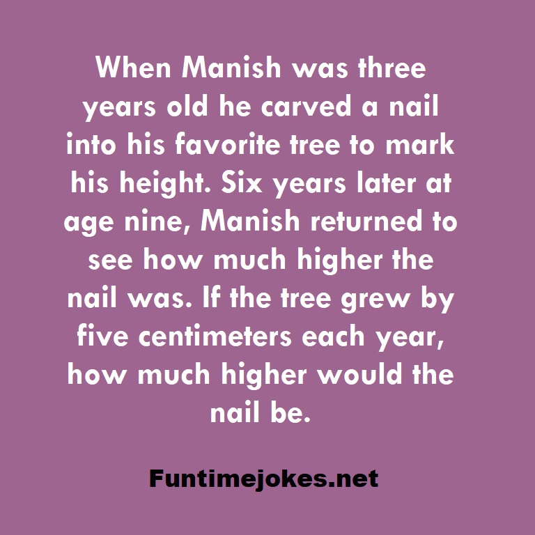 π Take the 15-Riddle Challenge (Win at 80%+)When Manish was three years old he carved a nail into his favorite tree to mark his height. Six years later at age nine, Manish returned to see how much higher the nail was. If the tree grew by five centimeters each year, how much higher would the nail be.