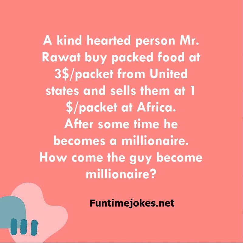 π Take the 15-Riddle Challenge (Win at 80%+)A kind hearted person Mr. Rawat buy packed food at 3$/packet from United states and sells them at 1$/packet at Africa. After some time he becomes a millionaire. How come the guy become millionaire?