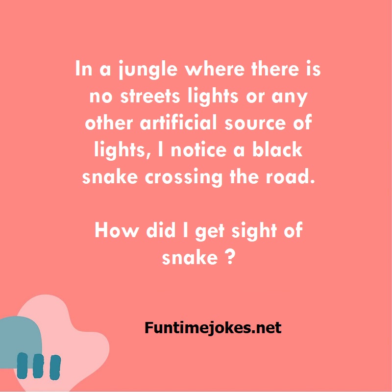 π Pop Balloon Riddles (Tap to reveal answers)In a jungle where there is no streets lights or any other artificial source of lights, I notice a black snake crossing the road. How did I get sight of snake ? is one of the best riddle of the day.We have best collections of riddles, You can see our best collection of Tricky Riddles with Answer
