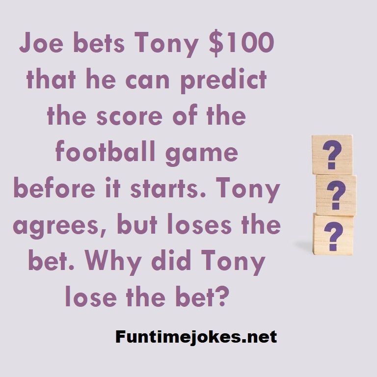 π Take the 15-Riddle Challenge (Win at 80%+)Joe bets Tony $100 that he can predict the score of the football game before it starts. Tony agrees, but loses the bet. Why did Tony lose the bet?
