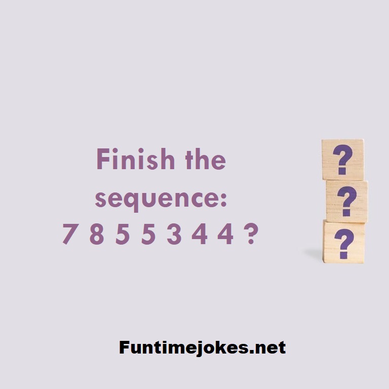 We encourage you to subscribe us to receive our Daily/Weekly riddles newsletter. Finish the sequence: 7 8 5 5 3 4 4 ? is one of the best riddle of the day.We have best collections of riddles, You can see our best collection of Tricky Riddles with Answer