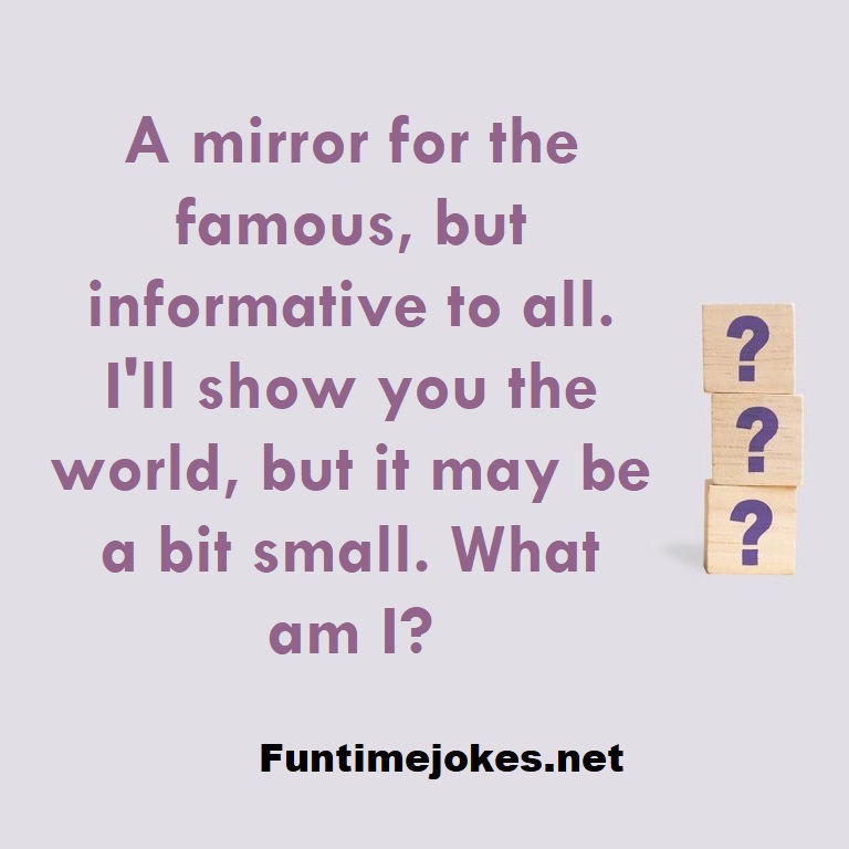 π Pop Balloon Riddles (Tap to reveal answers)A mirror for the famous, but informative to all. I'll show you the world, but it may be a bit small. What am I? is one of the best riddle of the day.We have best collections of riddles, You can see our best collection of Tricky Riddles with Answer