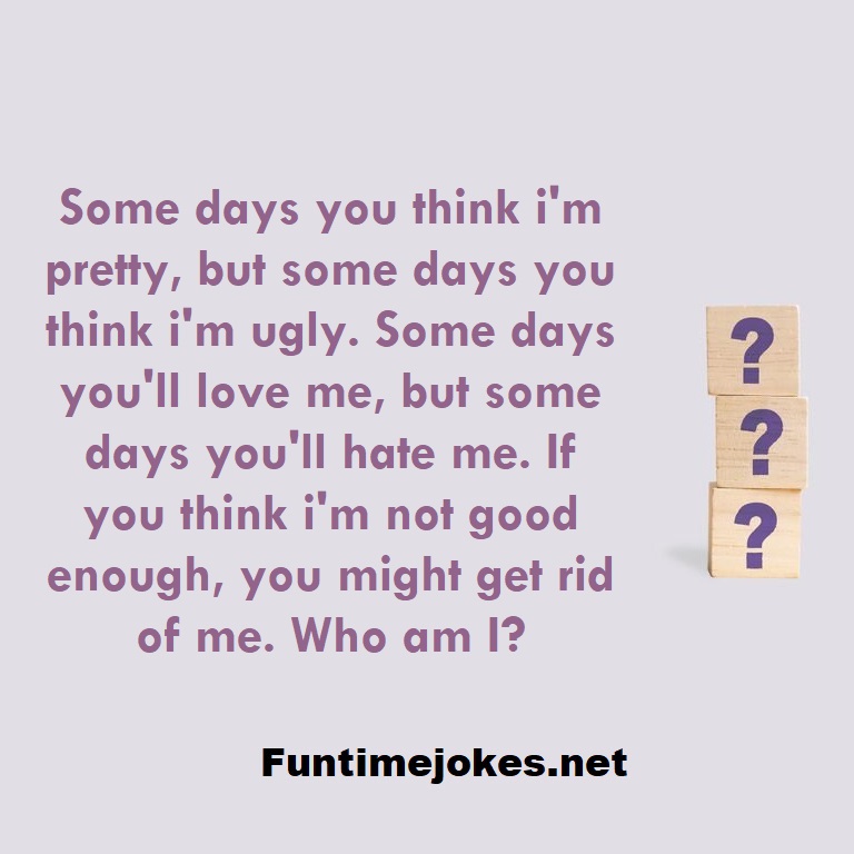 π Take the 15-Riddle Challenge (Win at 80%+)Some days you think i'm pretty, but some days you think i'm ugly. Some days you'll love me, but some days you'll hate me. If you think i'm not good enough, you might get rid of me. Who am I?